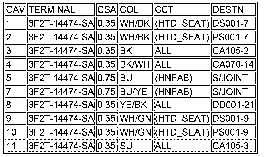 5. Cct: Identifies the model or option which uses the wire. 'ALL' means applicable to all models in the range fitted with the feature or system in question. In instances where different models, features or systems require different colour wires to be fitted in a cavity, each instance of the cavity is included in the pin-out table.