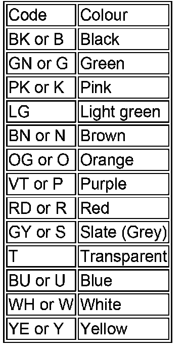 - Wire Chart (Pin-out table)-A six column table, giving details of each wire within the connector: