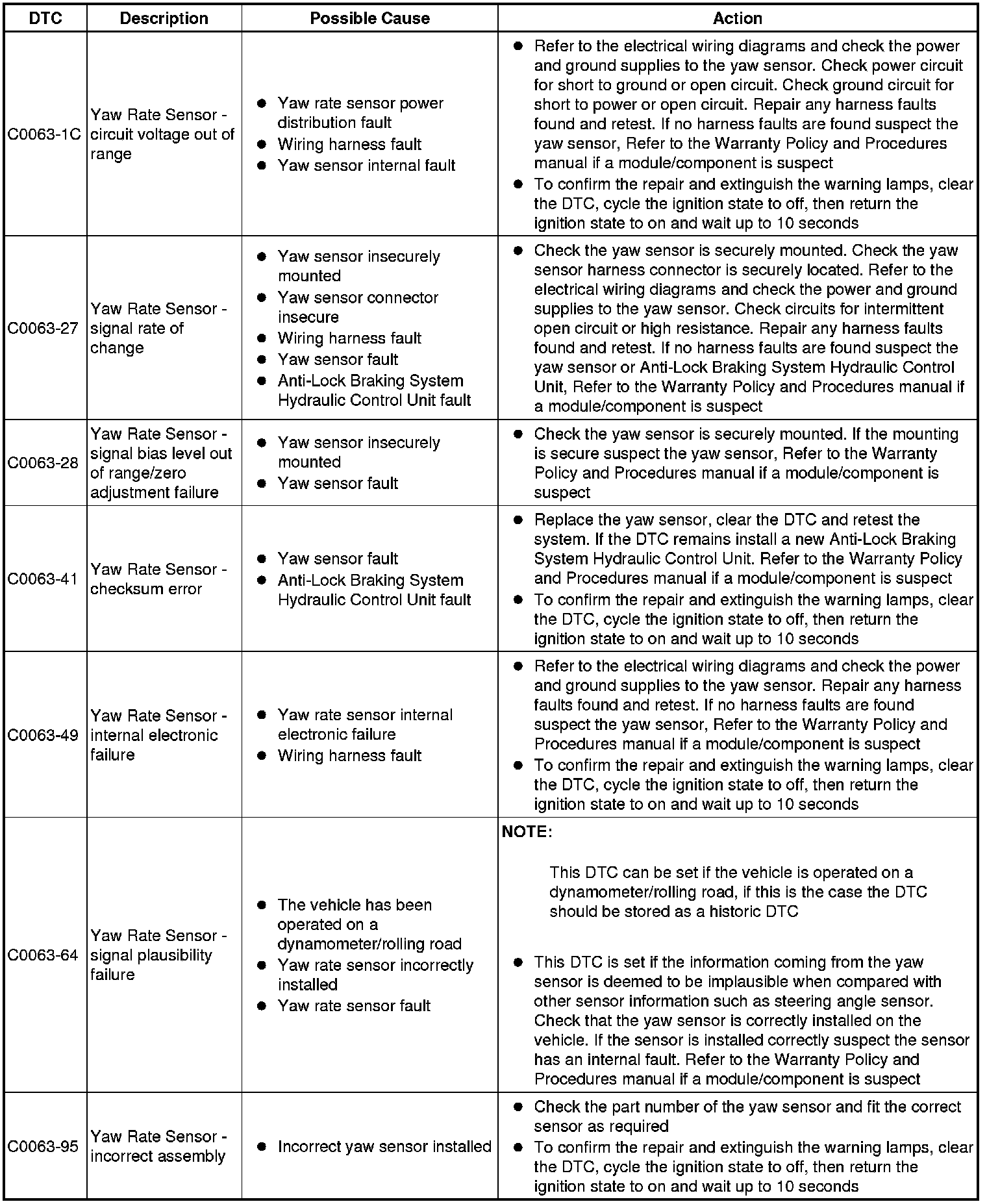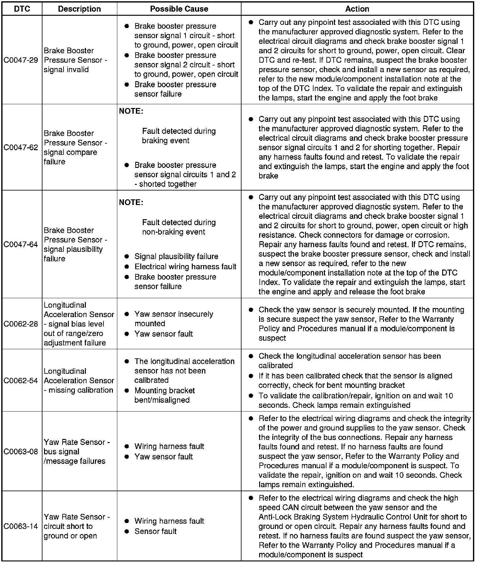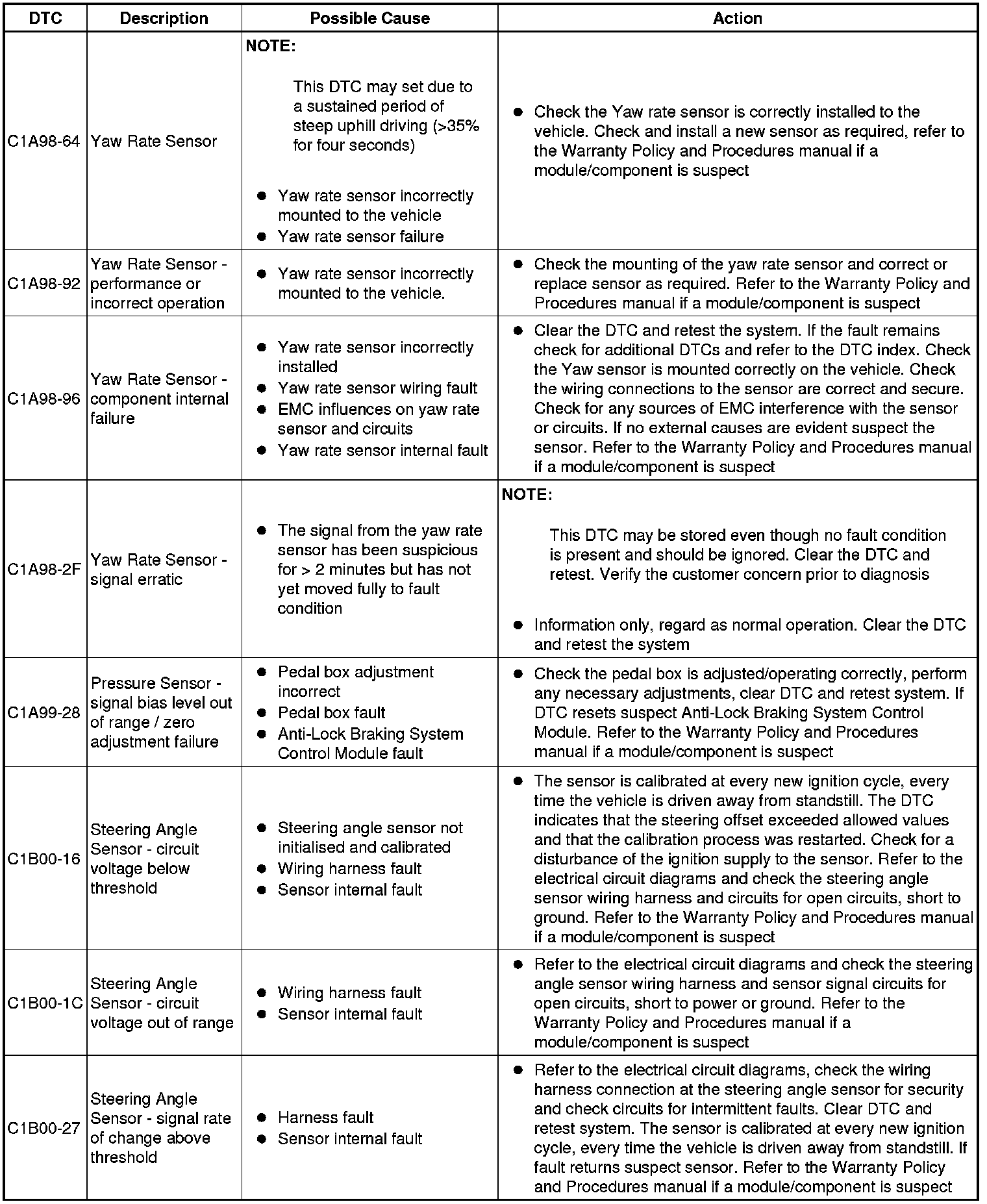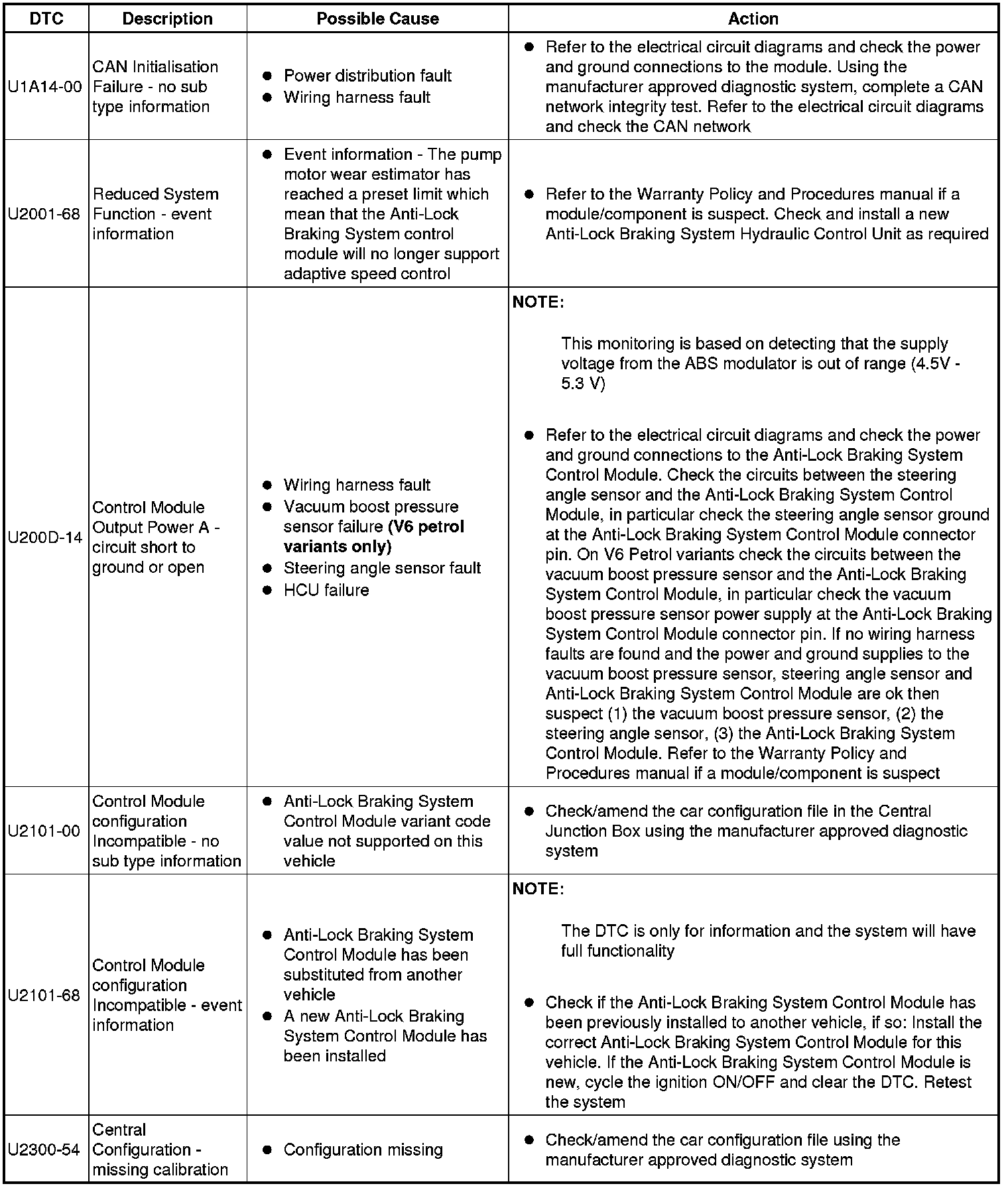 The table below lists all Diagnostic Trouble Codes (DTCs) that could be logged in the Anti-Lock Braking System module, for additional Diagnosis and Testing information refer to the relevant Diagnosis and Testing Section. For additional information, refer to Anti-Lock Control - Stability Assist Initial Inspection and Diagnostic Overview