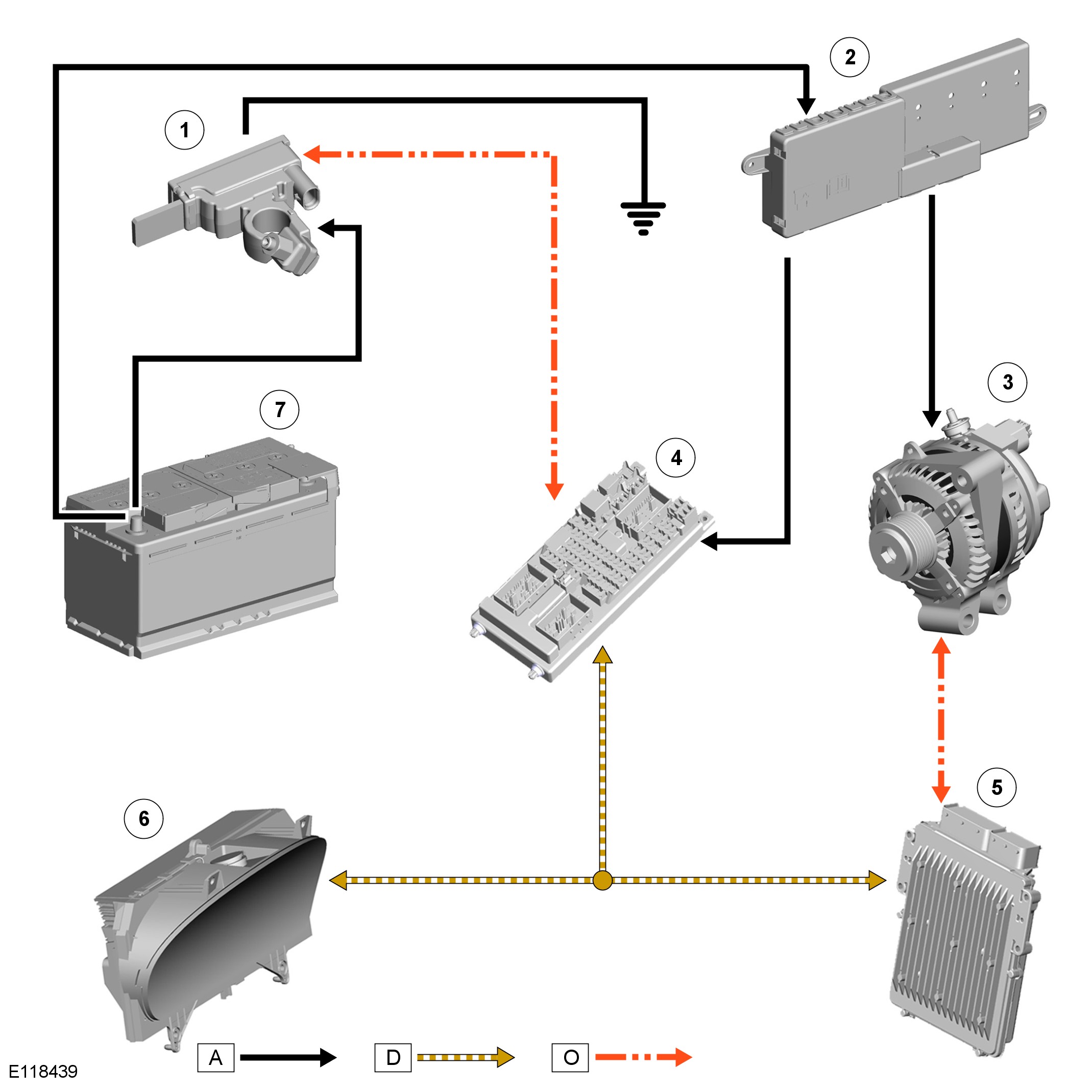 The battery monitoring system module measures battery current and voltage, which it communicates to the CJB (central junction box) over a LIN (local interconnect network) bus connection. The CJB (central junction box) transmits the battery information to the instrument cluster over the medium speed CAN (controller area network)bus. The instrument cluster acts as a gateway between the medium and high speed CAN bus networks, and transmits the battery condition information to the ECM (engine control module) over the high speed CAN (controller area network) bus. Based on the information received from the battery monitoring system module, the ECM (engine control module) will control the output from the generator and request the switching off of