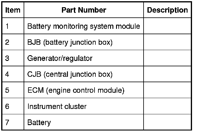 The battery negative terminal is fitted with a battery monitoring system module. The module is integral with the battery negative cable and communicates with the CJB (central junction box) via a LIN (local interconnect network) bus connection. The battery condition information is passed to the ECM (engine control module) which controls the generator output accordingly.
