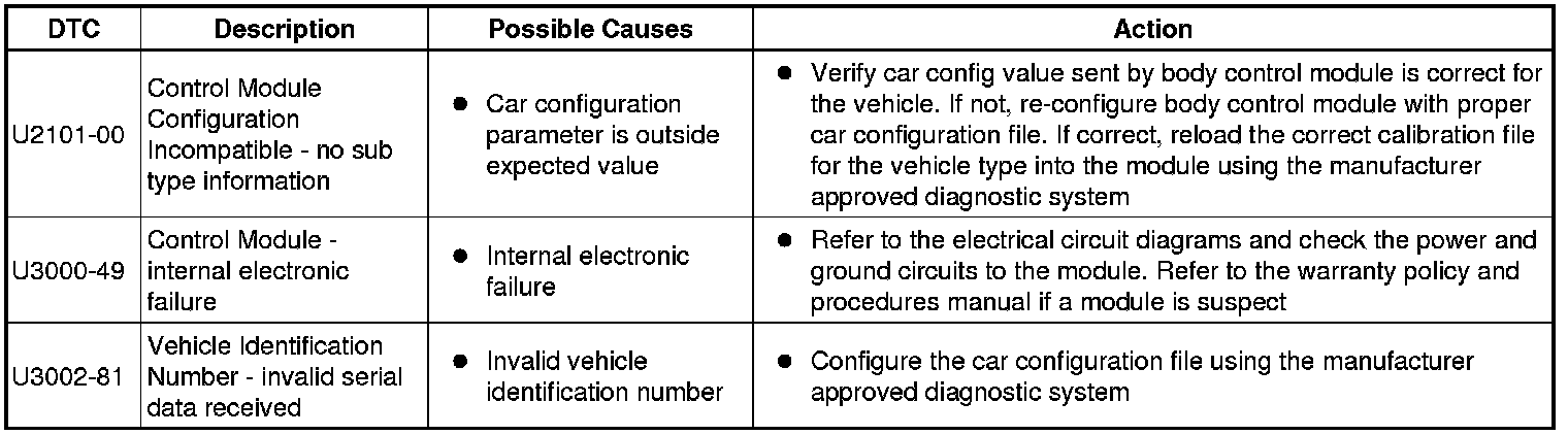 The table below lists all Diagnostic Trouble Codes (DTCs) that could be logged in the Remote Keyless Entry Module, for additional Diagnosis and Testing information refer to the relevant Diagnosis and Testing Section. For additional information, refer to Locks, Latches and Entry Systems Testing and Inspection