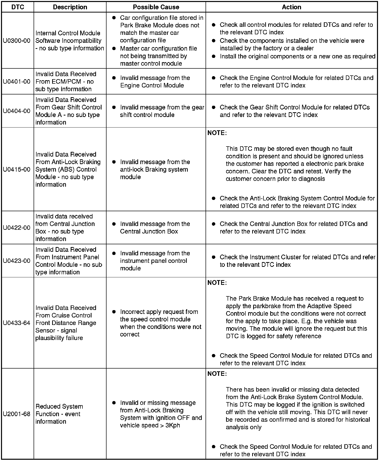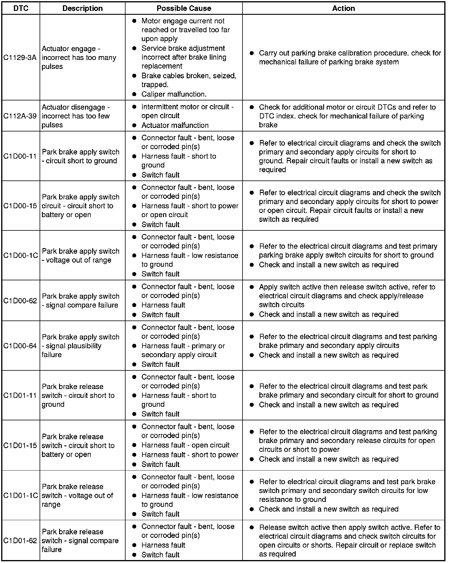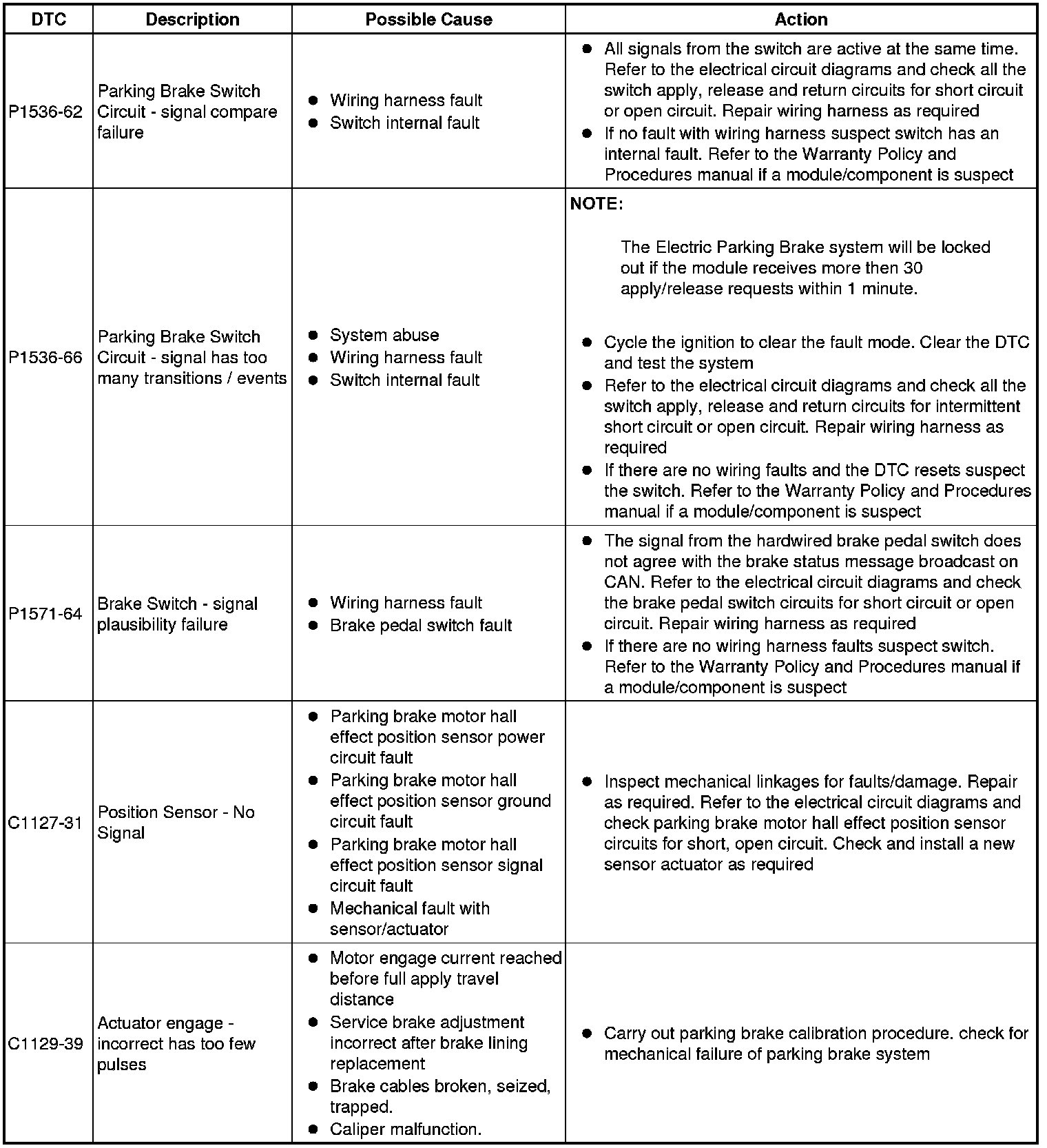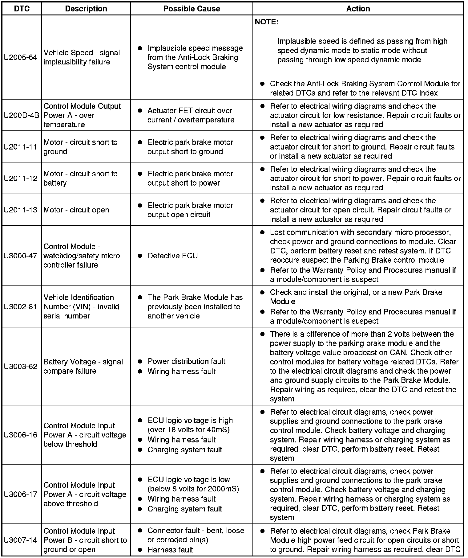 The table below lists all Diagnostic Trouble Codes (DTCs) that could be logged in the Electric Parking Brake module, for additional Diagnosis and Testing information refer to the relevant Diagnosis and Testing Section. For additional information, refer to Parking Brake Testing and Inspection