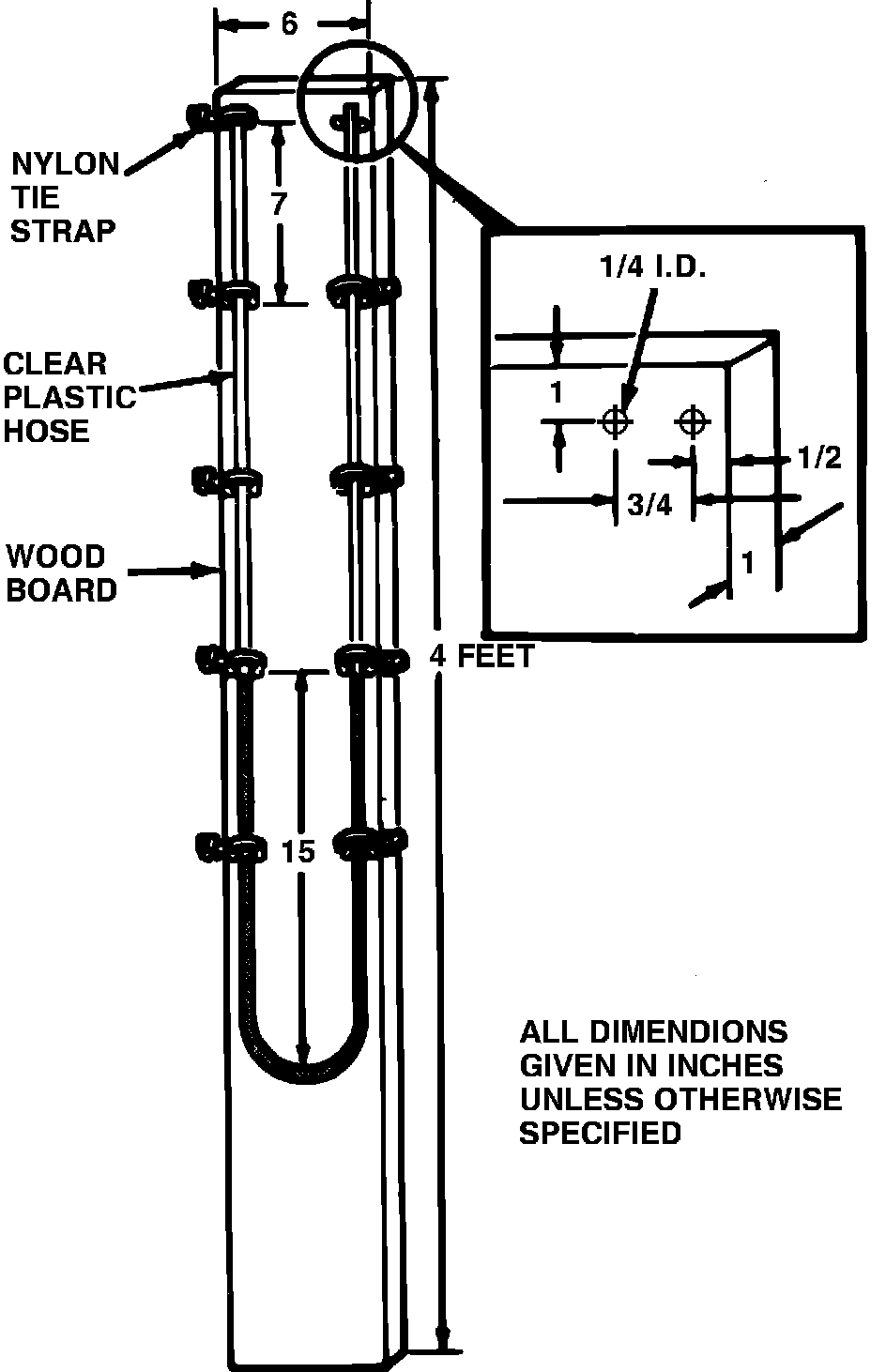 a. Attach a 6 foot length of clear plastic tubing (3/8 inch) to a 4 foot 6 inch 1 inch board, Fig. 17.
