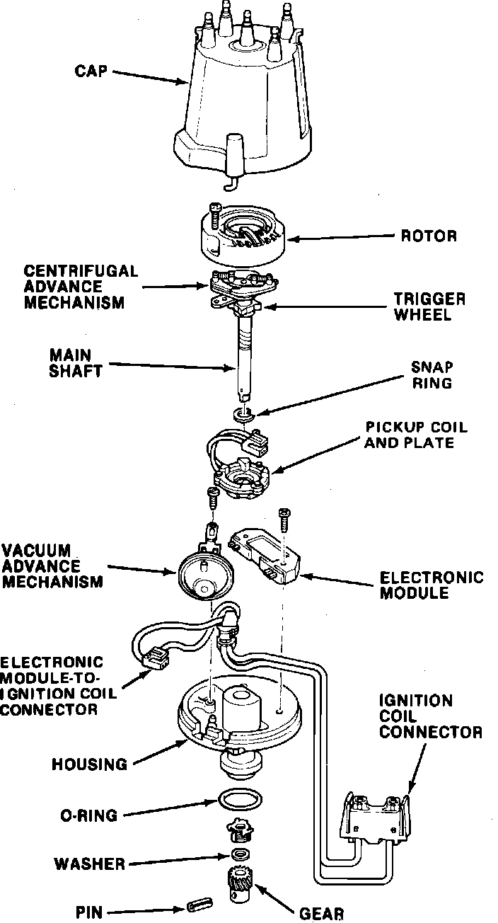 Fig. 1Exploded view of High Energy Ignition (HEI) Distributor. 4-151 model shown, V6-173 similar: