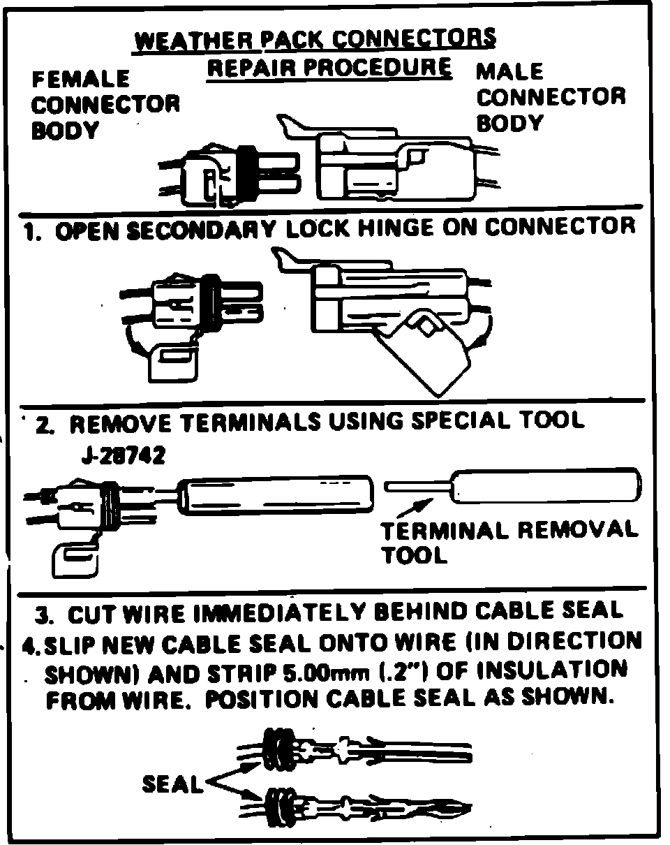 Due to low system voltages, special weather resistant connectors and wiring harnesses are used throughout the C3 system. If wiring and/or connectors are diagnosed as defective, special repair procedures must be followed. Damaged molded connectors must be replaced by splicing a new connector into the harness. Damaged ``Weather Pack'' connectors can be repaired as shown, Fig. 252. If ``Weather Pack'' terminals are damaged or bent, or if connector housings cause terminal misalignment, they must be replaced. Terminals should only be removed from ``Weather Pack'' connectors using tool No. J-28742 or equivalent. Use of any other type tool may deform the terminal or housing, and unlike standard blade-type terminals, these terminals cannot be straightened.
