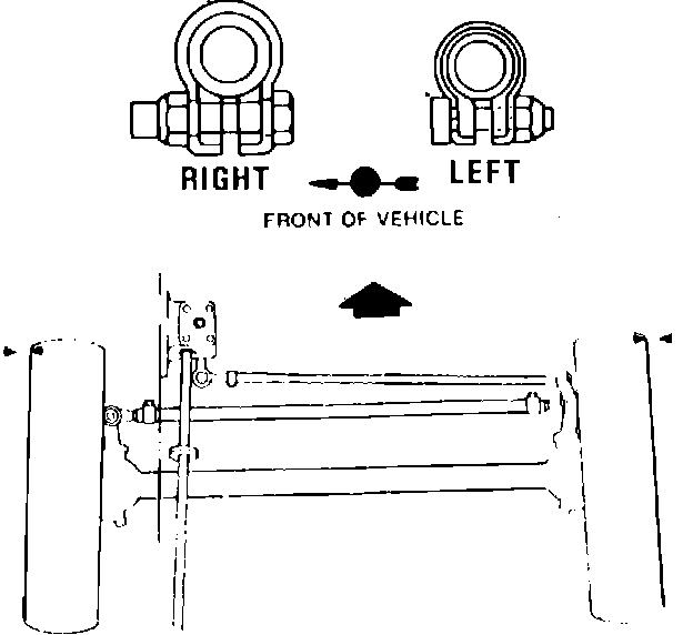 To adjust toe setting, center steering gear, then lock steering wheel to hold in position. Adjust right wheel toe setting by loosening clamp bolt and rotating center link connecting pitman arm to right wheel. Adjust left wheel toe setting by loosening clamp bolt and rotating the tie rod connecting the center link to the left wheel.