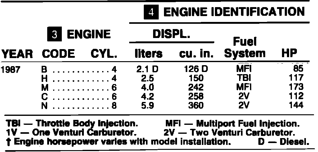 4 ENGINE IDENTIFICATION: On the line where the engine code appears, read to the right to identify the engine.