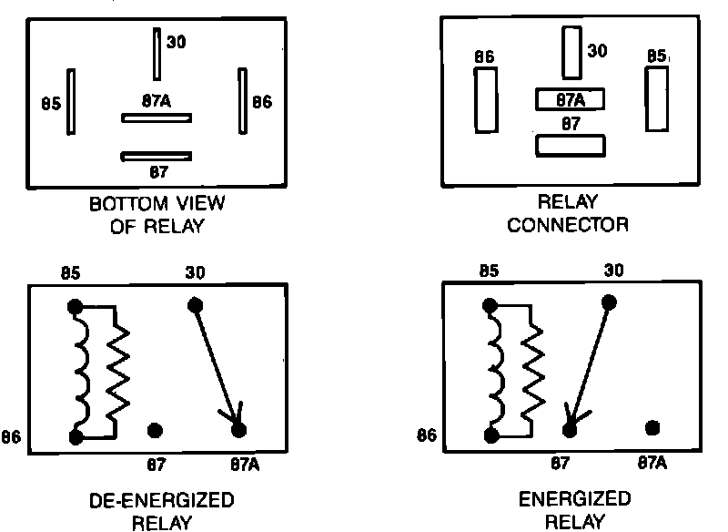 2. Using a suitable ohmmeter, check resistance between relay terminals 85 and 86. Ohmmeter reading should be 70 to 80 ohms for resistor relays and 81 to 91 ohms for diode relays.