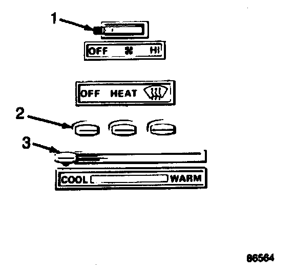 The heater and defroster controls consist of a fan control switch (1), a vacuum control switch operated by three pushbuttons (2) and a slide temperature control lever (3).