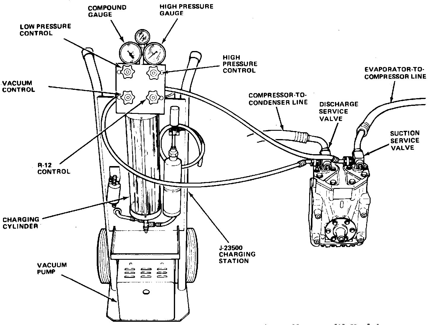 Fig. 3 Charging station J-23500-01 hose connections. Shown with York type compressor: