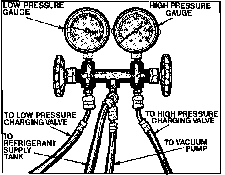 2. Connect compound (low) side gauge hose to the low (suction) side service port, and the high pressure gauge hose to the high (discharge) side port, then open compressor service valves to mid-position, if equipped.