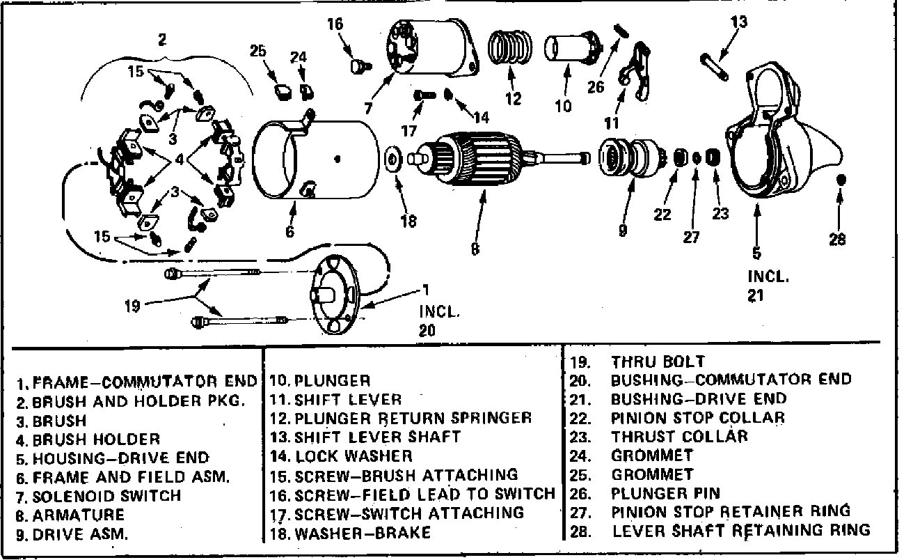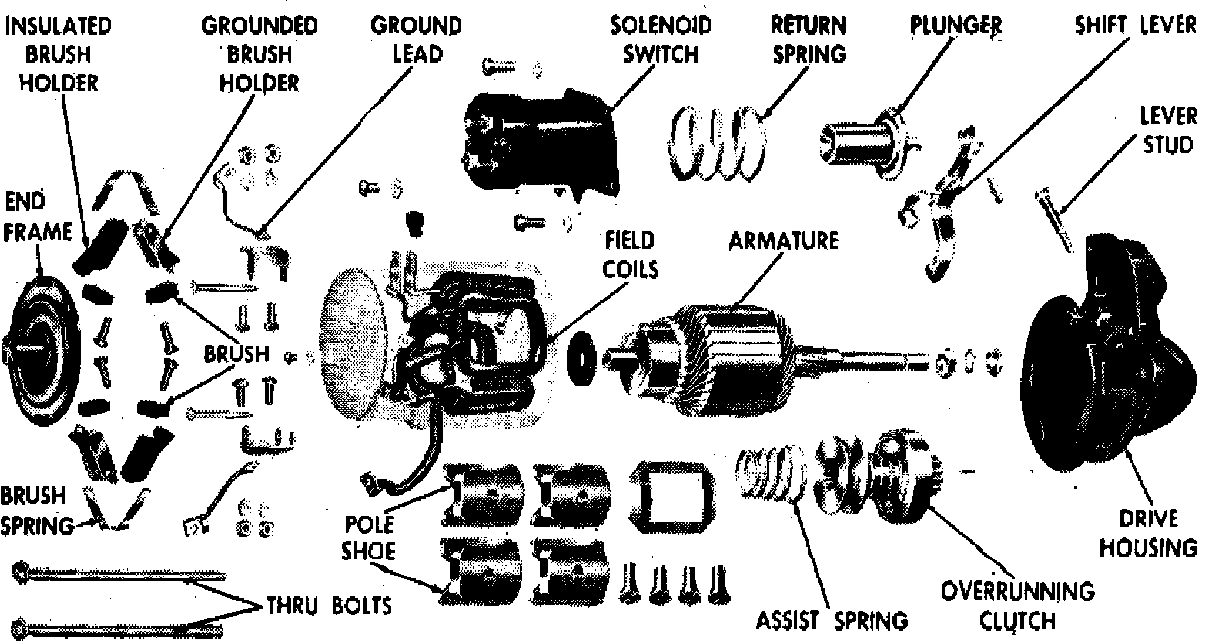 The Delco-Remy starter has the solenoid shift lever mechanism and the solenoid plunger enclosed in the drive housing to protect them from exposure to road dirt, icing conditions and splash. They have an extruded field frame and an overrunning clutch type drive. The overrunning clutch is operated by a solenoid switch mounted to a flange on the drive housing. The diesel starters, 25MT and 27MT, have a center bearing.