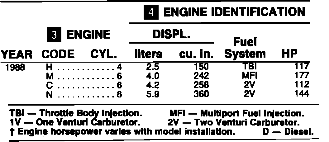 4 ENGINE IDENTIFICATION: On the line where the engine code appears, read to the right to identify the engine.
