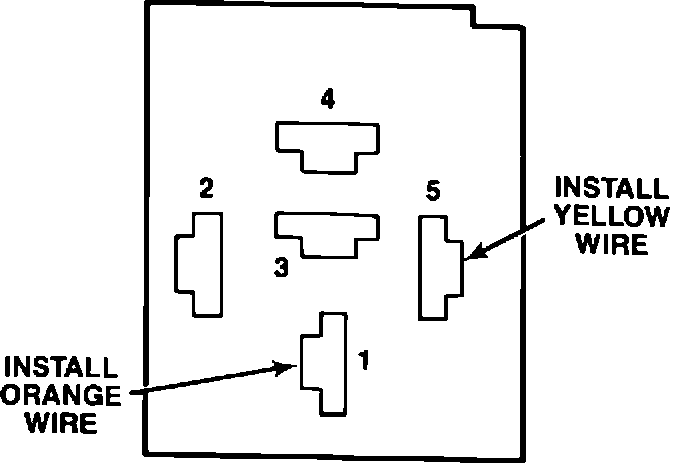 7. Insert a paper clip into cavities 1 and 5 from the relay side, to release the locking tab of the terminals. Switch the wires in the cavity holes. The orange wire (fuel pump feed) goes into cavity 1 and the yellow (ignition) wire goes into cavity 5. Figure 2