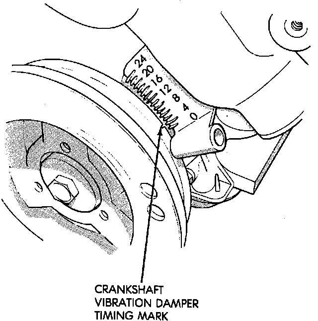 5. Turn the engine in a clockwise direction until the rotor is approaching the scribe mark on the distributor housing. Then slowly turn the engine until the timing mark on the crankshaft vibration damper lines up with zero on front cover timing scale.