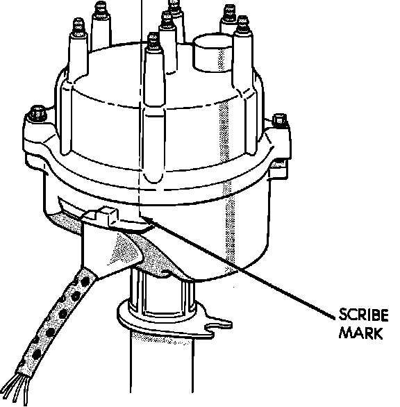 3. Scribe a mark on the distributor housing below the left side of the number one spark plug wire post of the distributor cap to use as a reference for #1 cylinder firing position.