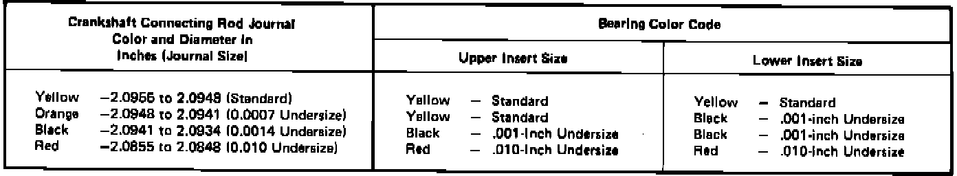 The connecting rod journal is identified by a color coded paint mark on adjacent cheek or counterweight toward flanged (rear) end of crankshaft. Color codes used to indicate journal sizes and corresponding bearing sizes are listed in Fig. 12.