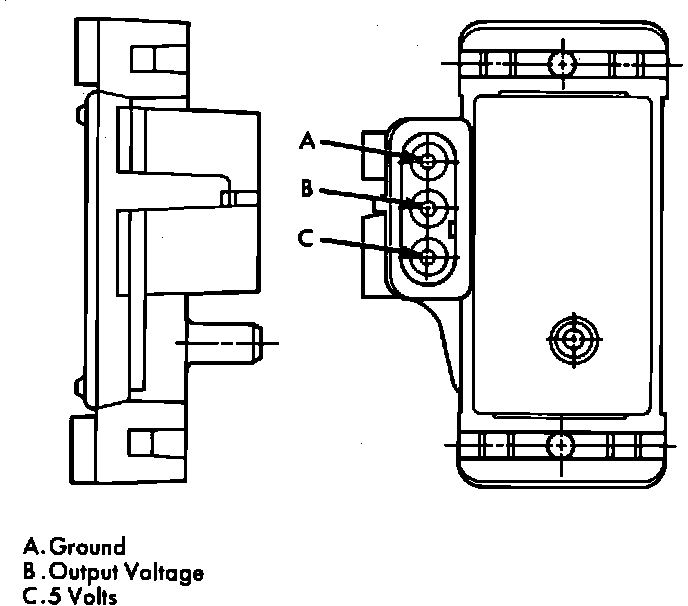 1. Turn the ignition switch ON (the engine should remain off), and test the voltage from connector terminal B to ground with a voltmeter. Voltage should be between 4 to 5 volts. With the engine started, warmed to normal operating temperature, and idling, the voltage output should drop to 1.5 to 2.1 volts.