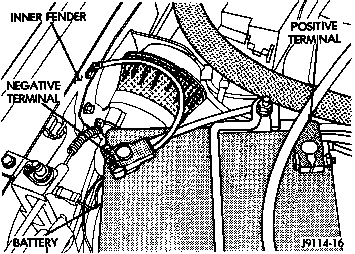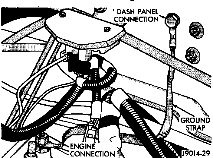 19. Inspect engine ground strap connections at dash panel and rear cylinder head bolt.