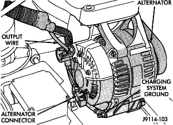 6. Verify that alternator output wire, alternator connector, and ground wire are firmly connected to the alternator.