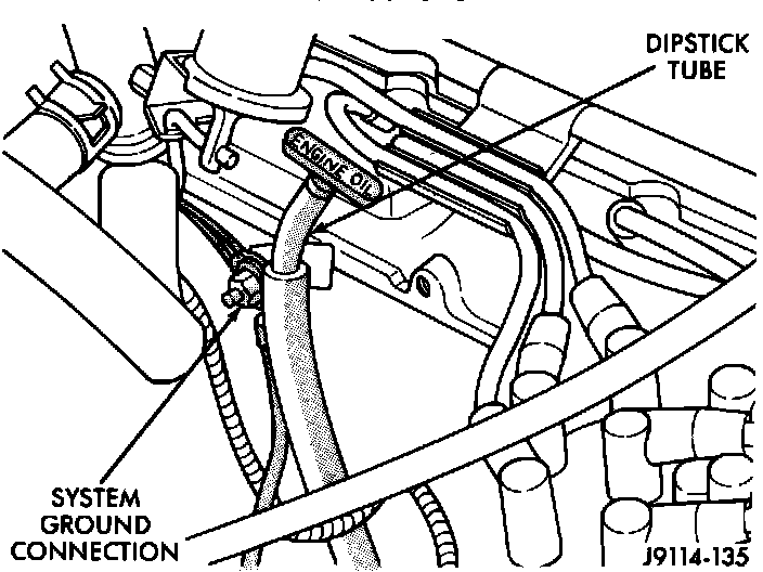 7. Inspect the system ground connections at the cylinder block behind the engine oil dipstick tube.