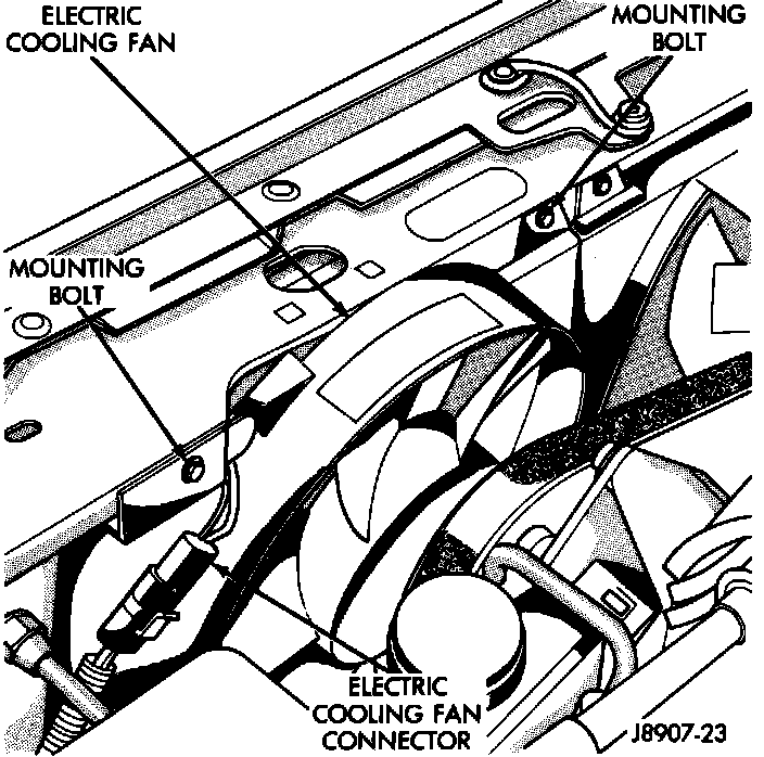 15. On XJ/MJ models equipped with 4.0L engine, verify that auxiliary cooling fan wire connector is firmly connected to harness.