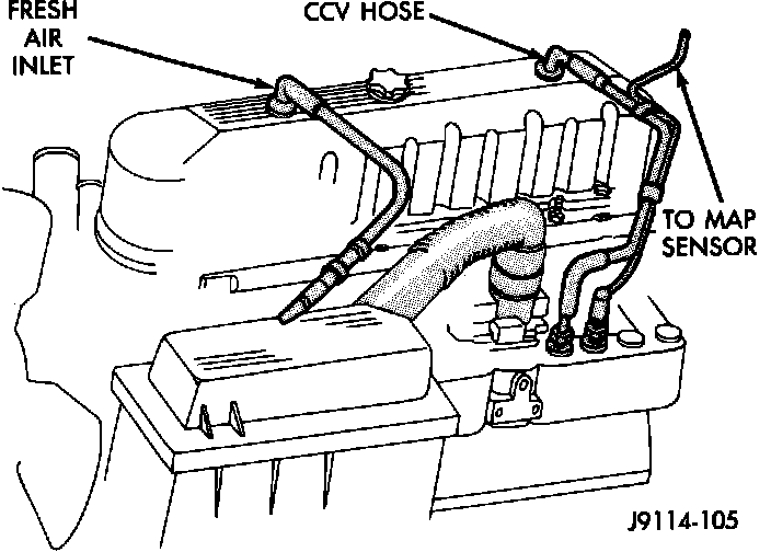 8. Verify that crankcase ventilation (CCV) fresh air hose is firmly connected to cylinder head and air cleaner covers.