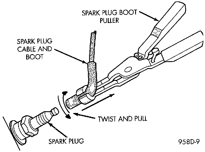 CAUTION: When disconnecting a high voltage cable from a spark plug or from the distributor cap, twist the rubber boot slightly (1/2 turn) to break it loose (Fig. 26). Grasp the boot (not the cable) and pull it off with a steady, even force.