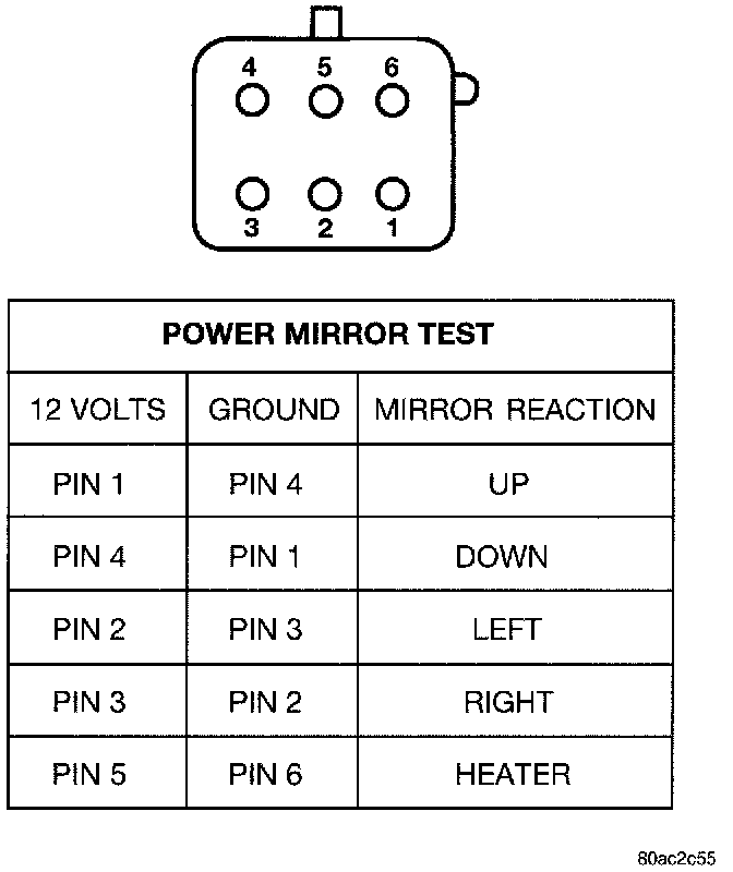 10. Connect the battery negative cable. Use two jumper wires, one connected to a 12 Volt battery feed, and the other connected to a good body ground. See the Body and Frame/Mirrors/Power Mirror Test chart for the correct jumper wire connections at the mirror half of the power mirror wire harness connector. If the mirror reactions are OK, repair the wire harness between the mirror and the stand-alone power mirror switch or the DDM as required. If the mirror reactions are not OK, replace the faulty power outside mirror assembly.