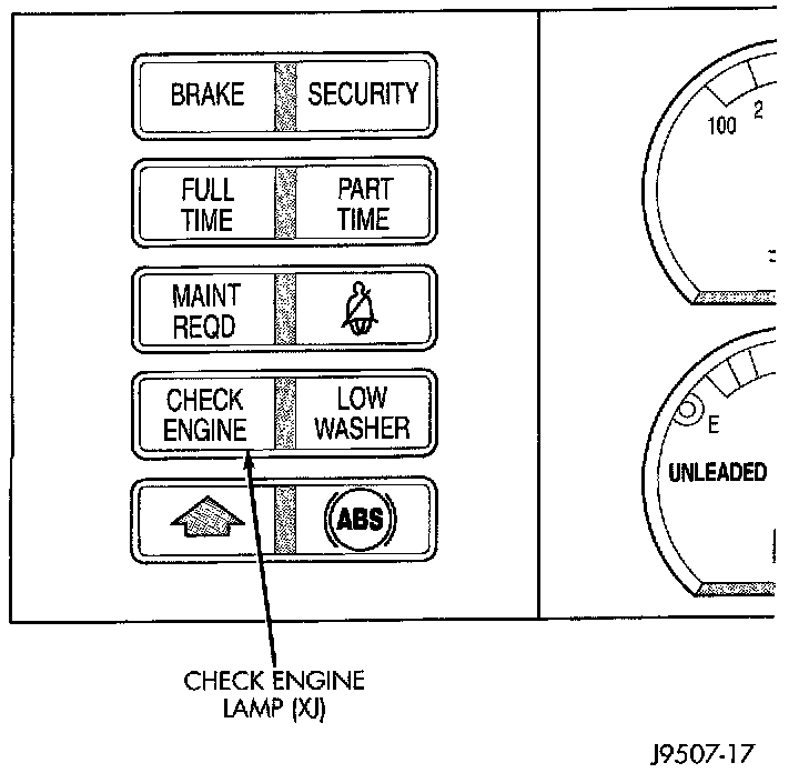 The malfunction indicator lamp illuminates each time the ignition key is turned on. It will stay on for approximately three seconds as a bulb test. The lamp is displayed on the instrument panel as the CHECK ENGINE lamp (Fig. 13).