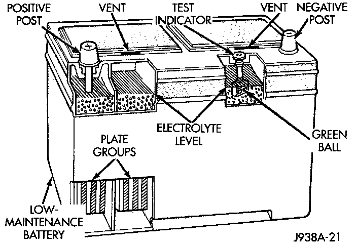 The factory-installed low-maintenance battery has removable battery cell caps. Water can be added to this battery The battery is not sealed and has vent holes in the cell caps. The chemical composition within the low-maintenance battery reduces battery gassing and water loss, at normal charge and discharge rates.
