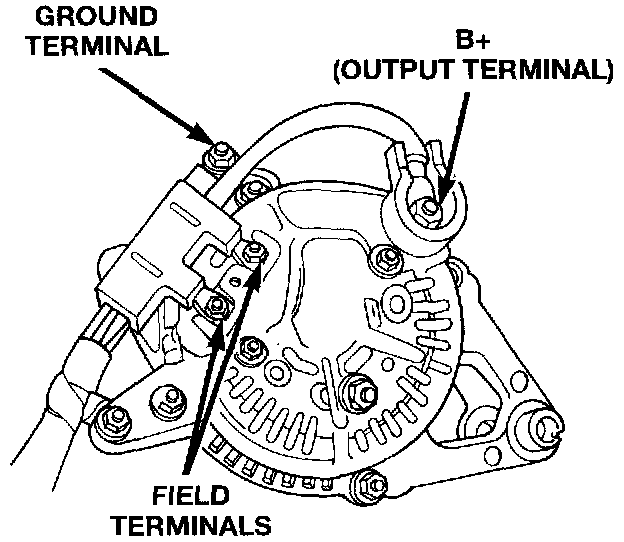 3. Connect one end of a jumper wire to a good ground. Connect the other end of jumper wire to the generator field driver (-) terminal. The 2 field terminals (+ and -) are located on the back of the generator. To locate and identify the (-) terminal and circuit. Another way to identify the (-) terminal is to start the engine and measure voltage at both field terminals. The (+) terminal will show battery voltage (12.5-14.5 Volts). The (-) terminal will show 3-5 Volts less than battery voltage.