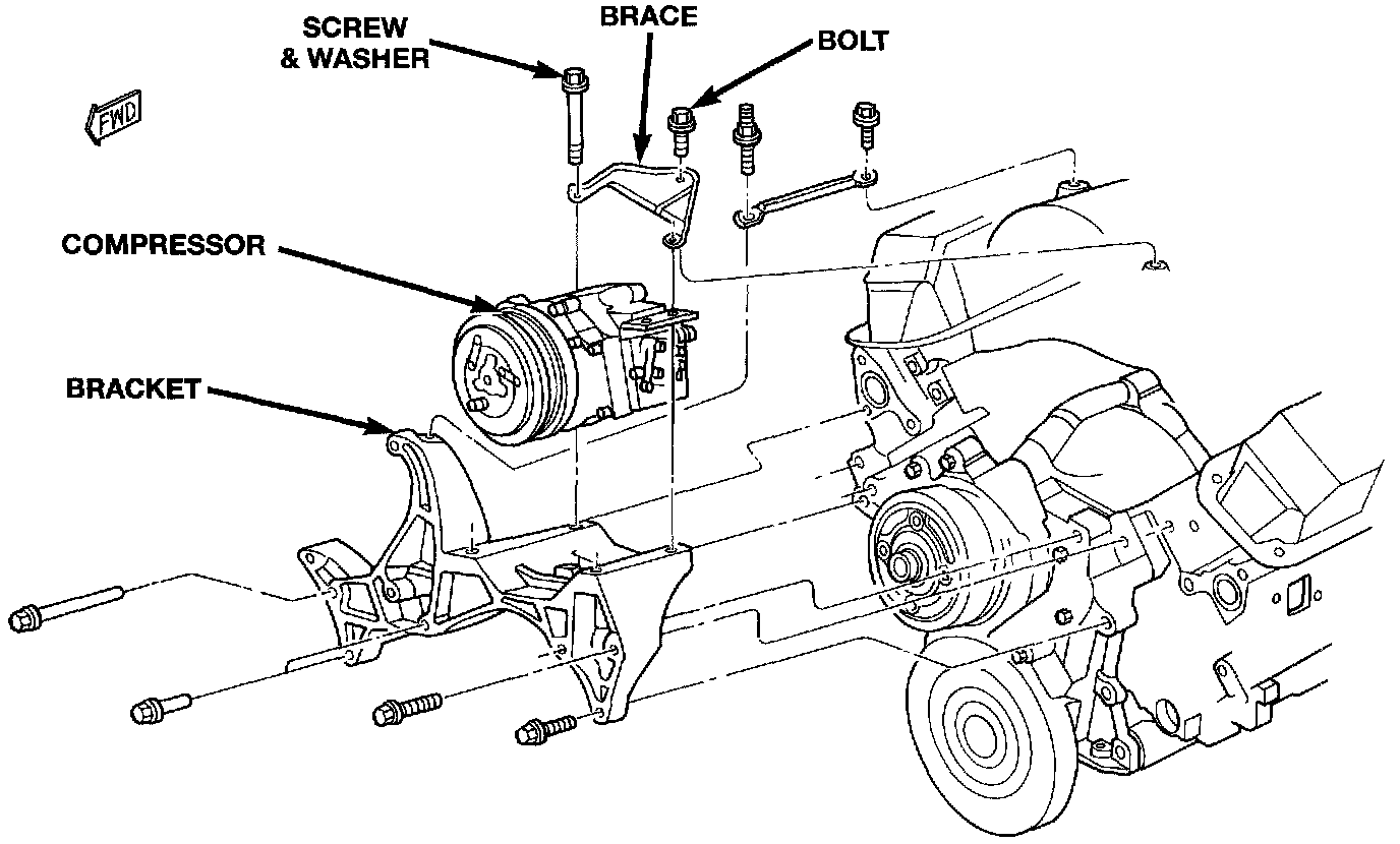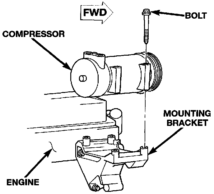 1. Install the compressor to the mounting bracket. Tighten the mounting screws to 28 N.m (21 ft. lbs.).