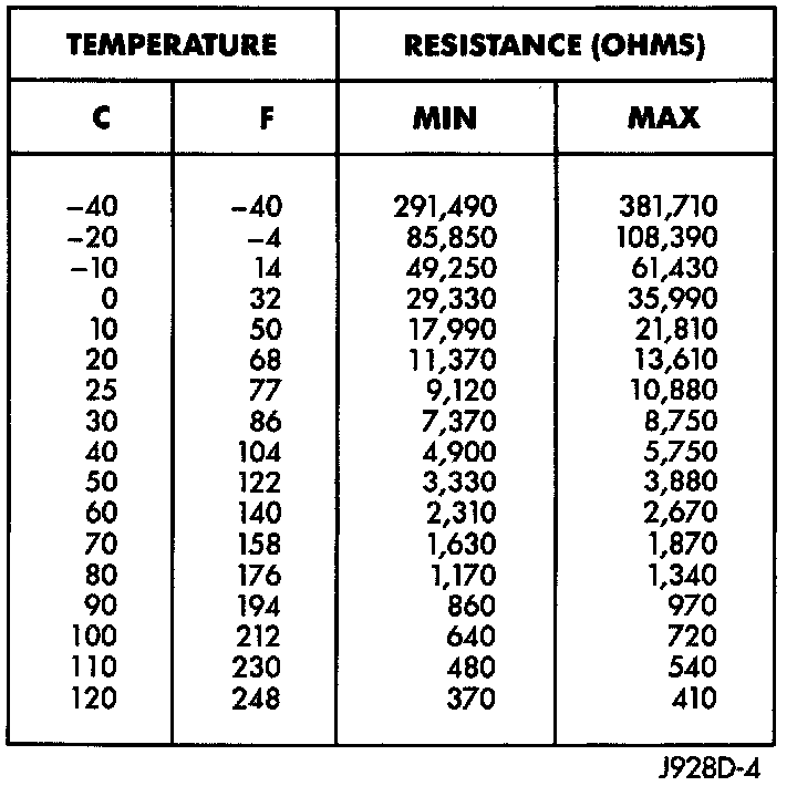 3. Test the resistance of the sensor with a high input impedance (digital) volt-ohmmeter. The resistance (as measured across the sensor terminals) should be as shown in the Coolant Temperature Sensor/Intake Air Temperature Sensor resistance chart. Replace the sensor if it is not within the range of resistance specified in the chart.