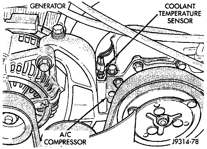 2. Engines with air conditioning: When removing the connector from sensor, do not pull directly on wiring harness. Fabricate an L-shaped hook tool from a coat hanger (approximately eight inches long). Place the hook part of tool under the connector for removal. The connector is snapped onto the sensor. It is not equipped with a lock type tab.