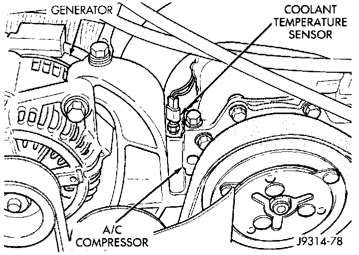 The engine coolant temperature sensor is installed next to the thermostat housing and protrudes into the water jacket. The sensor provides an input voltage to the Powertrain Control Module (PCM) relating coolant temperature. The PCM uses this input along with inputs from other sensors to determine injector pulse width and ignition timing. As coolant temperature varies, the coolant temperature sensor resistance will change. This change in resistance results in a different input voltage to the PCM.
