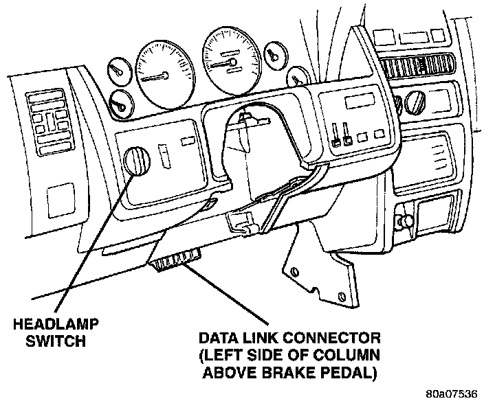 The 16-way data link connector (diagnostic scan tool connector) links the Diagnostic Readout Box (DRB) scan tool or the Mopar Diagnostic System (MDS) with the Powertrain Control Module (PCM). The data link connector is located under the instrument panel to the left of the steering column.