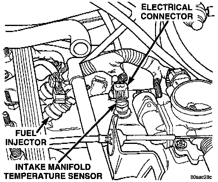 The intake manifold air temperature sensor is installed in the intake manifold with the sensor element extending into the air stream. The sensor provides an input voltage to the Powertrain Control Module (PCM) indicating intake manifold air temperature. The input is used along with inputs from other sensors to determine injector pulse width. As the temperature of the air-fuel stream in the manifold varies, the sensor resistance changes. This results in a different input voltage to the PCM.