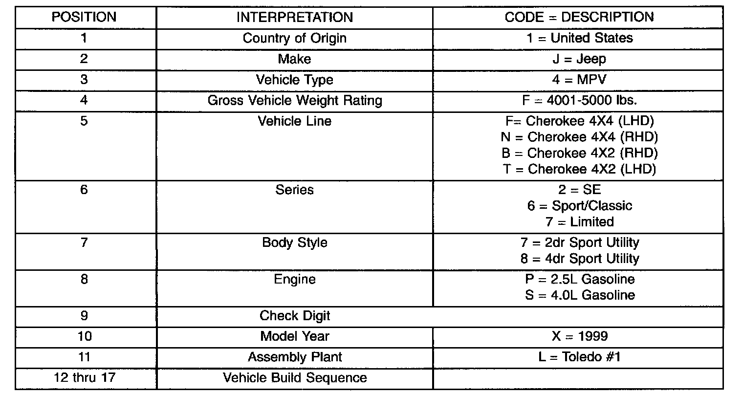 Vehicle Identification Number Decoding Chart: