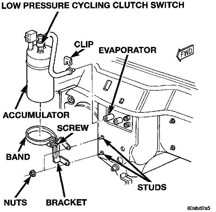 7. Pull the accumulator and retaining band until forward until the screw in the band is clear of the slotted hole in the support bracket on the dash panel.