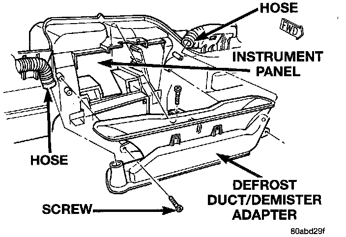 3. Remove the three screws that secure the defrost duct/demister adapter to the instrument panel.