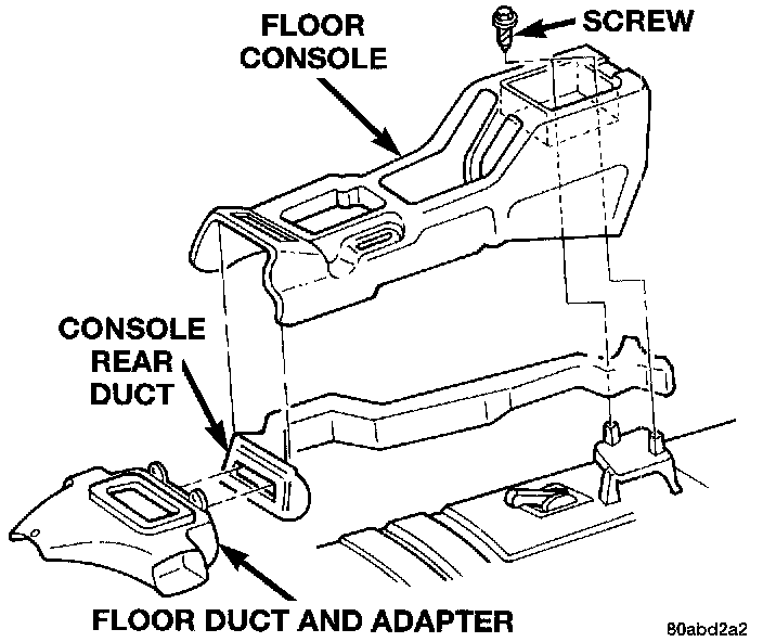 3. Lift the rear of the console rear duct out of the console rear mounting bracket on the floor panel transmission tunnel and slide the duct rearward to disengage it from the floor duct and adapter.