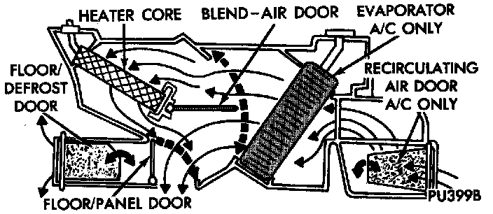 The heater and optional air conditioner are blend-air type systems. In a blend-air system, a blend-air door controls the amount of unconditioned air (or cooled air from the evaporator on models with air conditioning) that is allowed to flow through, or around, the heater core. A temperature control knob on the heater-A/C control panel determines the discharge air temperature by controlling an electric motor, which moves the blend-air door. This allows an almost immediate control of the output air temperature of the system.
