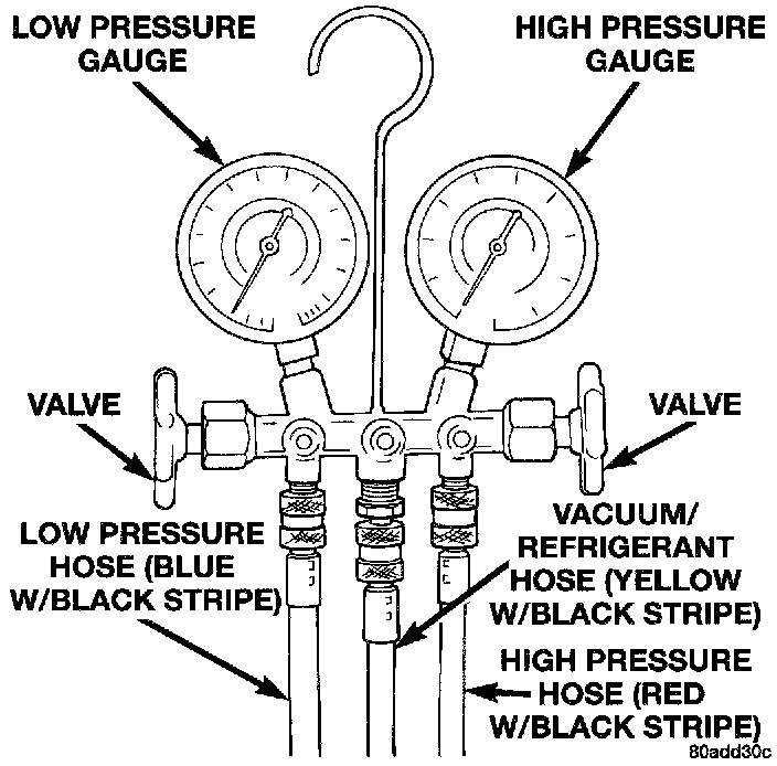 A manifold gauge set may be needed with some recovery/recycling/charging equipment. The service hoses on the gauge set being used should have manual (turn wheel), or automatic back-flow valves at the service port connector ends. This will prevent refrigerant from being released into the atmosphere.