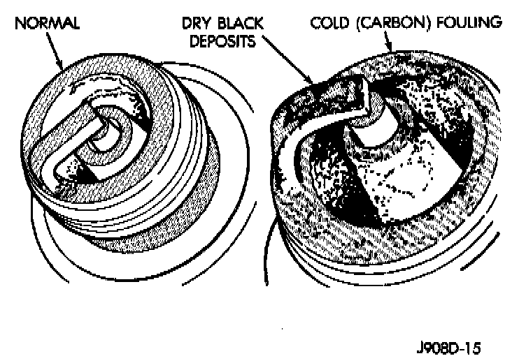 Cold fouling is sometimes referred to as carbon fouling. The deposits that cause cold fouling are basically carbon. A dry, black deposit on one or two plugs in a set may be caused by sticking valves or defective spark plug cables. Cold (carbon) fouling of the entire set of spark plugs may be caused by a clogged air cleaner element or repeated short operating times (short trips).