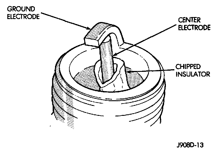 A chipped electrode insulator usually results from bending the center electrode while adjusting the spark plug electrode gap. Under certain conditions, severe detonation can also separate the insulator from the center electrode. Spark plugs with this condition must be replaced.