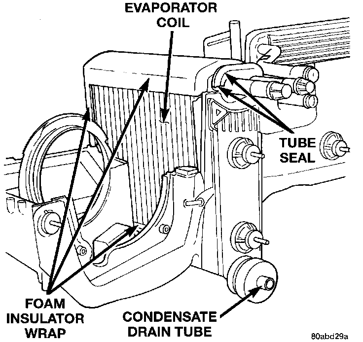 3. Reverse the removal procedures to install. Be certain that the evaporator foam insulator wrap and rubber tube seal are reinstalled.