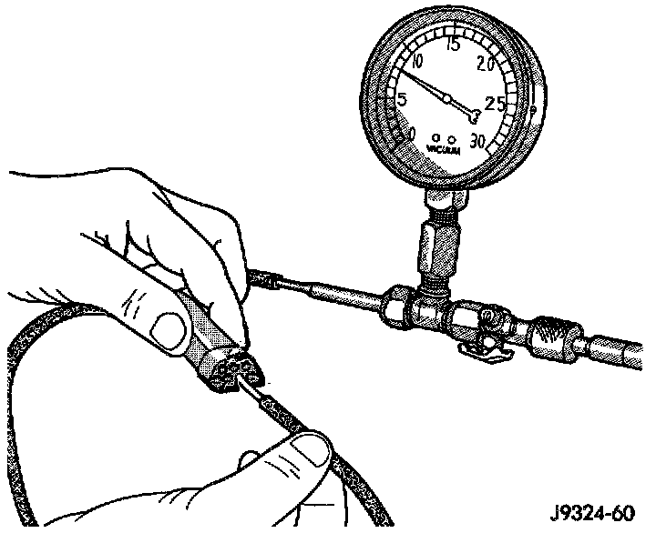 5. Connect the test set hose or probe to the open end of the leaking circuit. The test set gauge should return to the 27 kPa (8 in. Hg.) setting shortly after each connection is made. If OK, replace the faulty disconnected component. If not OK, go to Step 6.