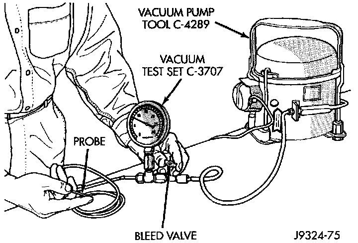 Use an adjustable vacuum test set (Special Tool C-3707-B) and a suitable vacuum pump to test the heater-A/C vacuum control system. With a finger placed over the end of the vacuum test hose probe, adjust the bleed valve on the test set gauge to obtain a vacuum of exactly 27 kPa (8 in. Hg.). Release and block the end of the probe several times to verify that the vacuum reading returns to the exact 27 kPa (8 in. Hg.) setting. Otherwise, a false reading will be obtained during testing.